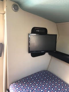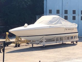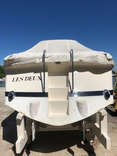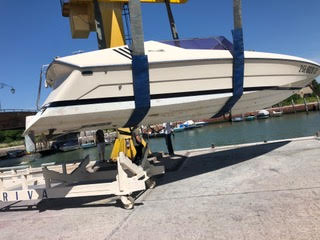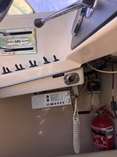 Ci sono 3 tendalini, di cui uno originale piccolo, il secondo originale in tela bianca poco pratico e tenuta dai 4 candelieri ed un terzo provvisto di archi piu’ alti in modo di stare in piedi all’interno del pozzetto munito di luci notturne. E’ provvista del suo telone di copertura originale blu e di ulteriori teloni sia per la copertura parziale che totale in materiale piu’ leggero di colore sabbia per poterla usare di notte. Il WC e’ stato sostituito anche con bidet con acqua calda ma c’e’ anche l’originale. Le 4 pompe di sentina sono tutte elettriche, c’e’ l’impianto a 220 volt con differenziale, prese a 12 volt, carica batteria, 3 batterie, autoradio Sony con bluetooth, telecomando, CD e TV con dvd, USB ed antenna. Dotata di impianto antincendio automatico (non a polvere ma a gas inerte per saturazione) nel vano motori con allarme e n. 3 estintori.